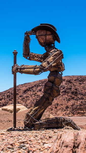 Dieser Lone Man kniet mit beiden Beinen auf einer Anhöhe, hält in der linken Hand eine Stange,